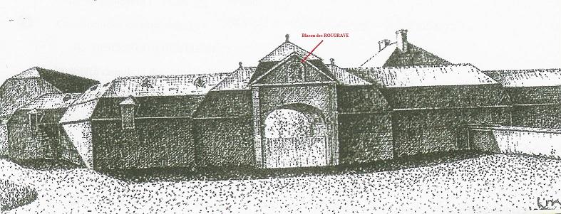 Le château est une construction de 1717 en calcaire dévossien (pierre bleue) que fit construire le Seigneur Jean Charles François Joseph de ROUGRAVE. Le porche est en moellon assisé, coiffé de toitures d'ardoises à brisis.Son portail en forme d'ansse de panier sur impostes moulurées, cantonne de pilastres d'angles qui portent un fronton triangulaire. Au centre de celui-ci, un blason muet (sans devise) flanqué d'un hercule et d'une licorne sous une couronne comtale. On passe sous la voûte du porche caractérisée par un berceau surbaissé, renforcé par quatres doubleaux (arc intérieurs). Cette ouverture sert d'entrée principale vers la cour d'honneur (cour haute) et le château.