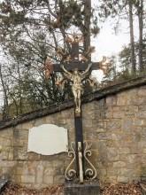 Situé rue Bourgmestre Octave Targez, 7 à Romedenne. Incrustée dans le soubassement d'une habitation en pierre calcaire et briques, la croix est selon la tradition locale, placée à l'envers, la face sculptée à l'intérieur et serait marquée d'une coquille. Profondeur:10cm, Largeur:60cm, Hauteur:80cm. Selon la tradition locale,cette croix rappellerait aux habitants et aux pèlerins que ce lieu servait de gîte et de sécurité sur le chemin de Compostelle. Au cours de la première moitié du 19ème siècle, une épidémie de typhus envahit Romedenne et la maladie cessa de se propager à partir de cette maison.Les villageois crurent à l'effet magique de cette croix. (d'après "La Nouvelle Gazette du 19-11-1987).