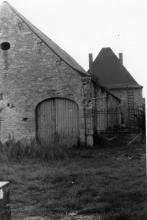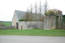 Situé rue Ernest Lahaye. Portail en pierre bleue de grange surbaissé et harpé dont la clé de voute porte la date de 1738. Ouverture permettant d’entrer ou de sortir d’un lieu fermé. Profondeur:1cm, Largeur:356cm, Hauteur:408cm. Le pignon de l’ancienne grange du château se trouve sur la façade Est devant une pelouse. A gauche du portail, un mur de séparation du domaine public avec le domaine privé et une porte donnant accès à la prairie. A droite, une petite tourelle semi-circulaire ainsi qu’une porte dans le mur du jardin. Au-dessus du pignon, un œil-de-bœuf.