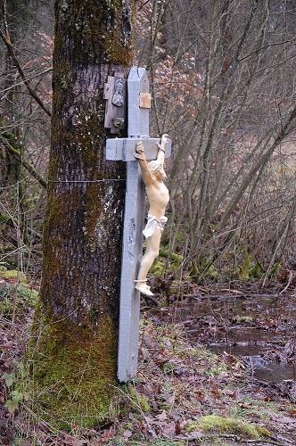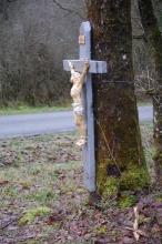 Croix fixée sur un chêne à l’orée du bois, Située Rue de la Fagne entre les parcelles Roly Section B 12 A et Fagnolle Section A 405 B. La croix : Hauteur: 160 cm. Largeur 100 cm. Le Christ: Hauteur: 70 cm