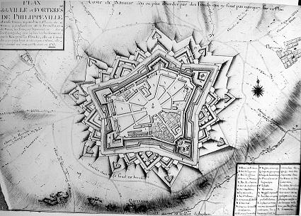 Ce fut le premier jour d'octobre, 1555, que Guillaume jeta les fondements de la nouvelle ville. Le tracé des retranchements présentait la forme d'un pentagone irrégulier L'enceinte était composée de cinq bastions à orillons et d'autant de courtines : trois d’entre elles offraient un grand développement ; La courtine 4-5 était en ligne droite; les deux plus longues se trouvaient brisées vers le milieu à angle rentrant ; on avait établi deux portes qui étaient percées dans le milieu de chacune des courtines les moins étendues et formant aussi une ligne droite; une de ces portes donnait issue sur le chemin conduisant à Givet et à Dinant, l'autre s'ouvrait sur la route de Mariembourg et vers le Hainaut. Des fossés secs entouraient la place de tous Côtés et étaient traversés par deux ponts ...