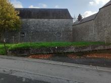Situé Place Saint Médard N° 11. Mur de séparation en pierres bleues sèches entourant partiellement le jardin situé devant la maison Place Saint Médard. Délimite la parcelle Samart Section A No 82 B avec le de domaine public (chemin No 6 et chemin No 16). Quelques arbustes ainsi qu’une pelouse ont poussé devant le mur en pierres sèches. A droite de l’ancienne pompe, présence d’un tas de moellons en pierre et d’une ancienne citerne. Profondeur:1900cm, Largeur:60cm, Hauteur:140cm. Les personnes nées avant la 2ème guerre ont toujours connu ce mur. Ce mur en pierres sèches devrait être davantage mis en valeur devant le château classé.